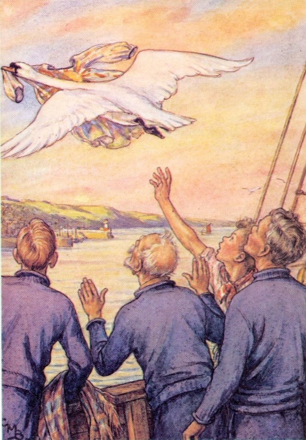 Als de zeeman de jurk laat zien, zeggen zijn maten dat het een toverjurk is, zo mooi. Maar dan horen ze ineens een zwoesj en een grote zwaan pikt de jurk uit zijn handen en vliegt ermee weg.