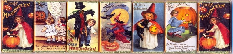 Halloween, All hallow's Eve, de avond voor allerheiligen op 31 oktober. De nacht dat de geesten, elfen en andere wezens - overigens niet altijd even aardig - uit de Andere wereld op bezoek komen in de echte wereld. Het is Nederland ingevlogen vanuit Amerika en Engeland. In de winkels zie je heksenhoeden, spinnen, mummies en monsters. Hartstikke leuk. Maar niet de moderne afbeeldingen, daar kun je genoeg van vinden op internet. Waar het mij voornamelijk om gaat, zijn de oudere kaarten die gemaakt zijn voor Halloween.