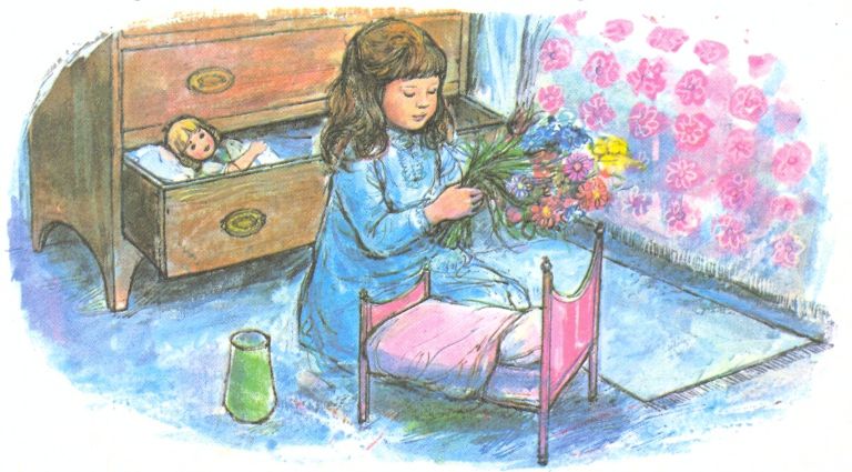 Kleine Ida ziet dat de bloemen in de vaas er slapjes bij staan en ze vraagt aan de tuinman waarom dat zo is. Hij vertelt dat de bloemen gewoon moe zijn omdat ze elke avond dansen. 'Dansen?' vraagt Ida.