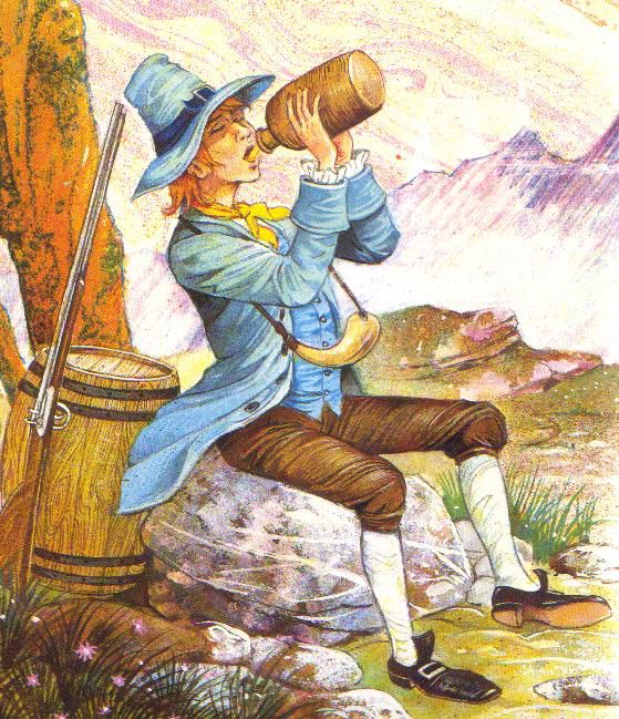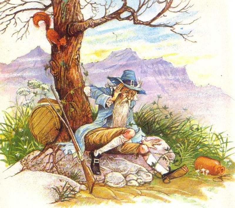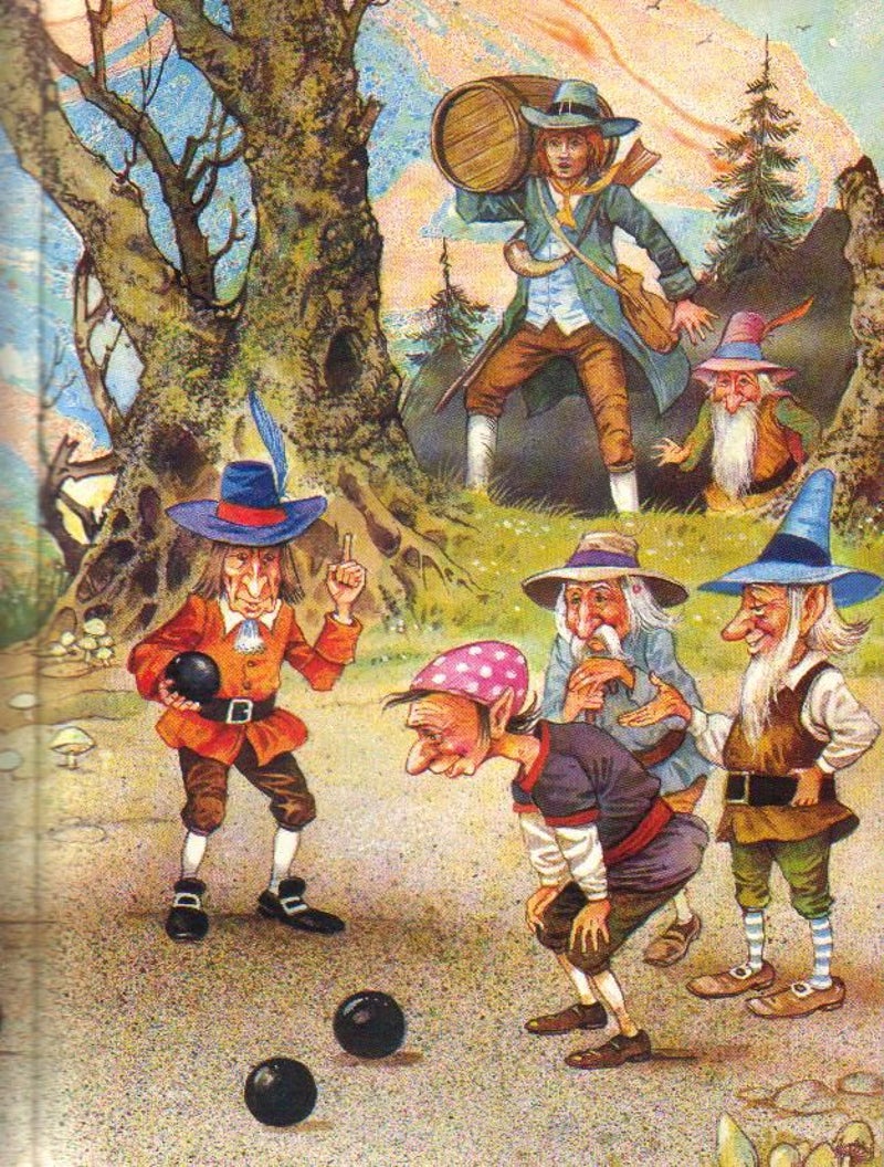 Daarom ging hij vaak de bergen in om te jagen. Op een dag toen hij aan het jagen was, kwam hij een klein mannetje tegen dat een ton op zijn rug droeg. Hij vroeg Rip hem te helpen en aardig als hij was, deed Rip dat natuurlijk. Al voelde hij zich niet helemaal op zijn gemak door de ogen van het mannetje.