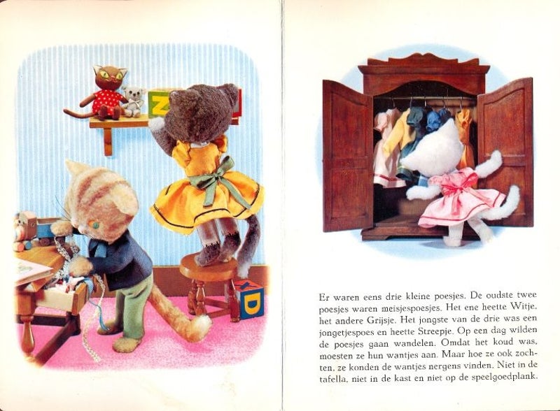 Ach... die kleine poesjes. Taart eten zonder wantjes aan. Die moederpoes kan wel heel snel breien. Deze komt uit 1968.