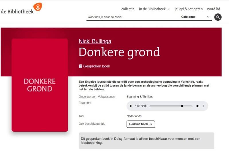 Het boek is ook een GESPROKEN BOEK. Bij de bibliotheek kunnen mensen met een leesbeperking dit aanvragen. Daisy rom bij Passend Lezen.